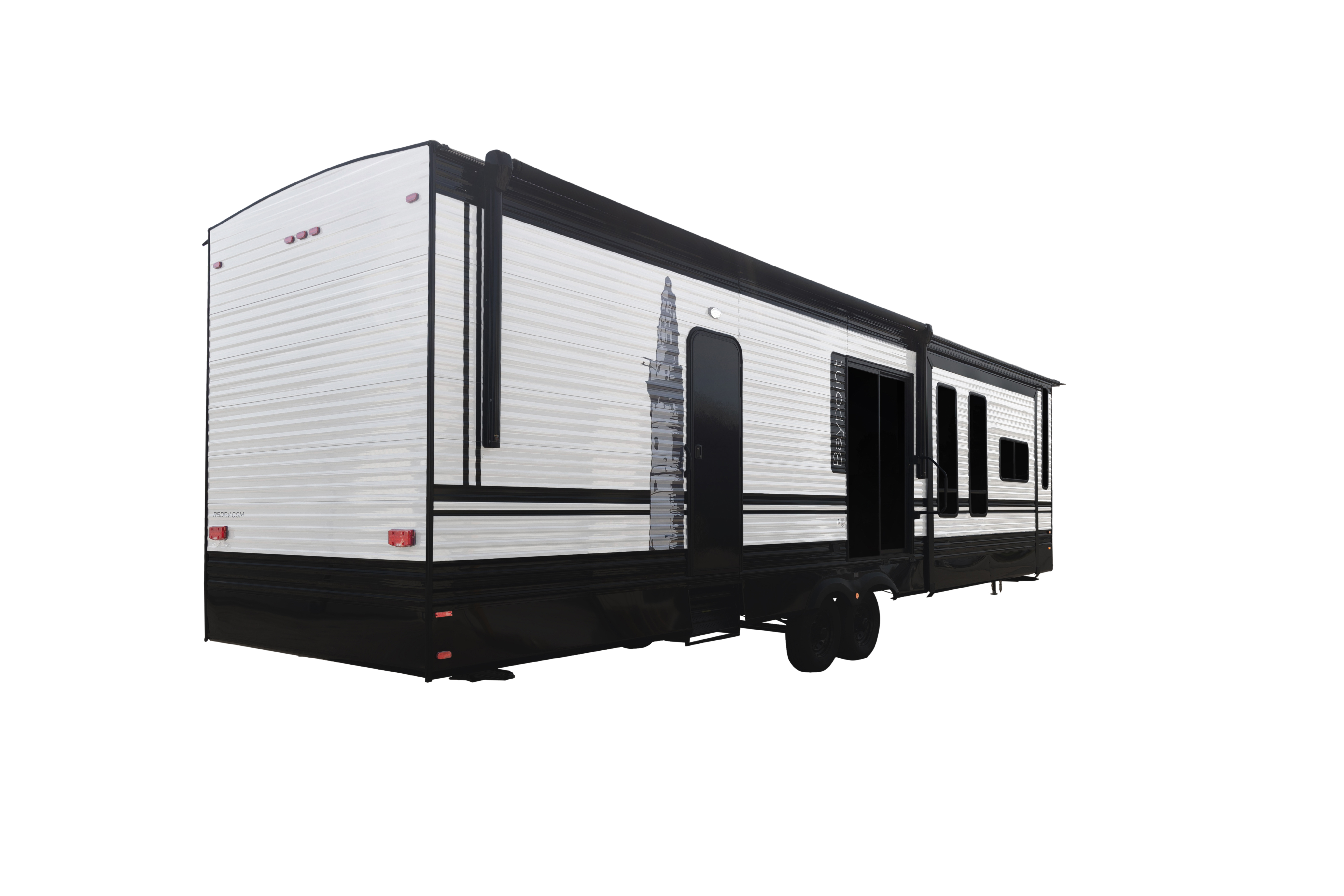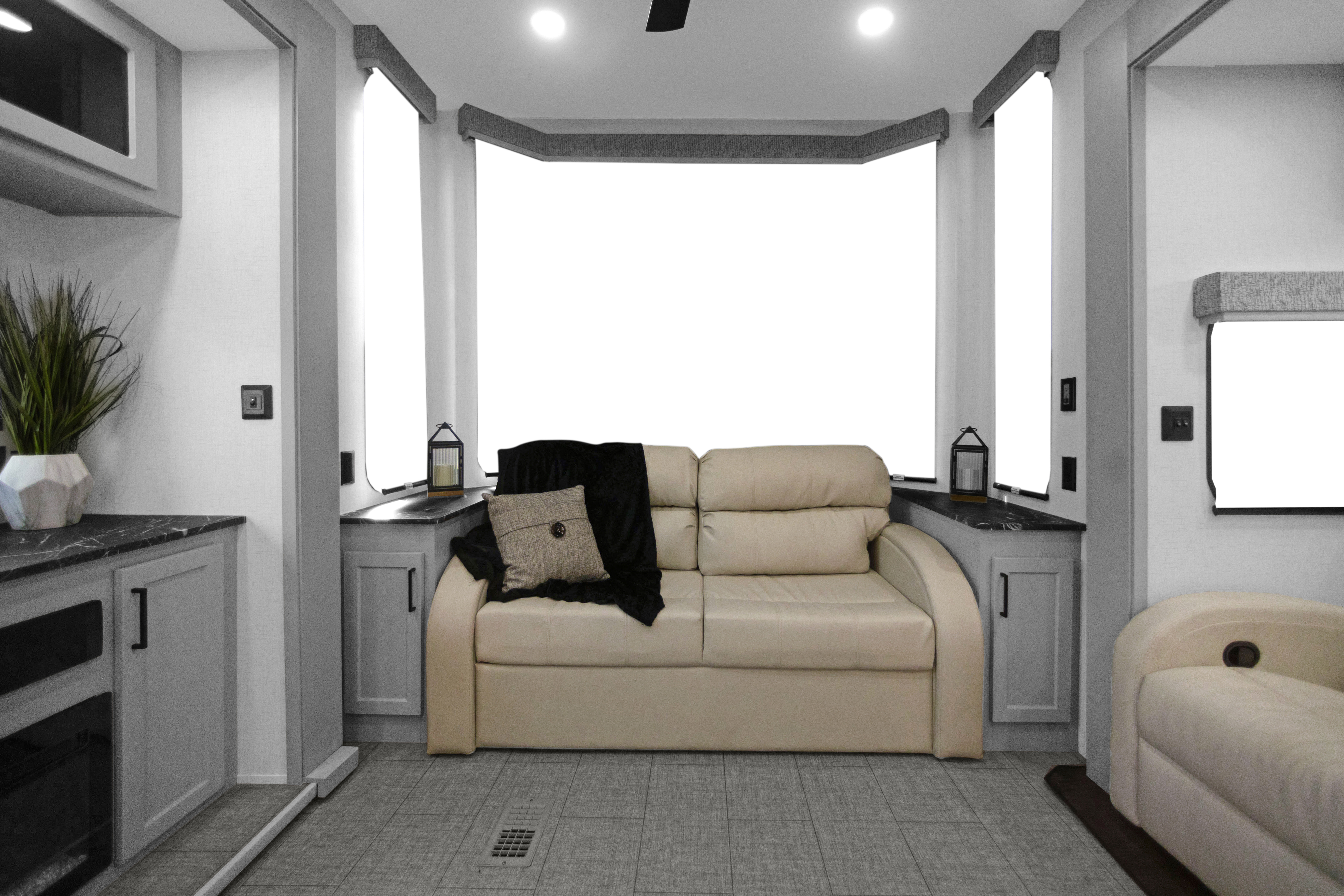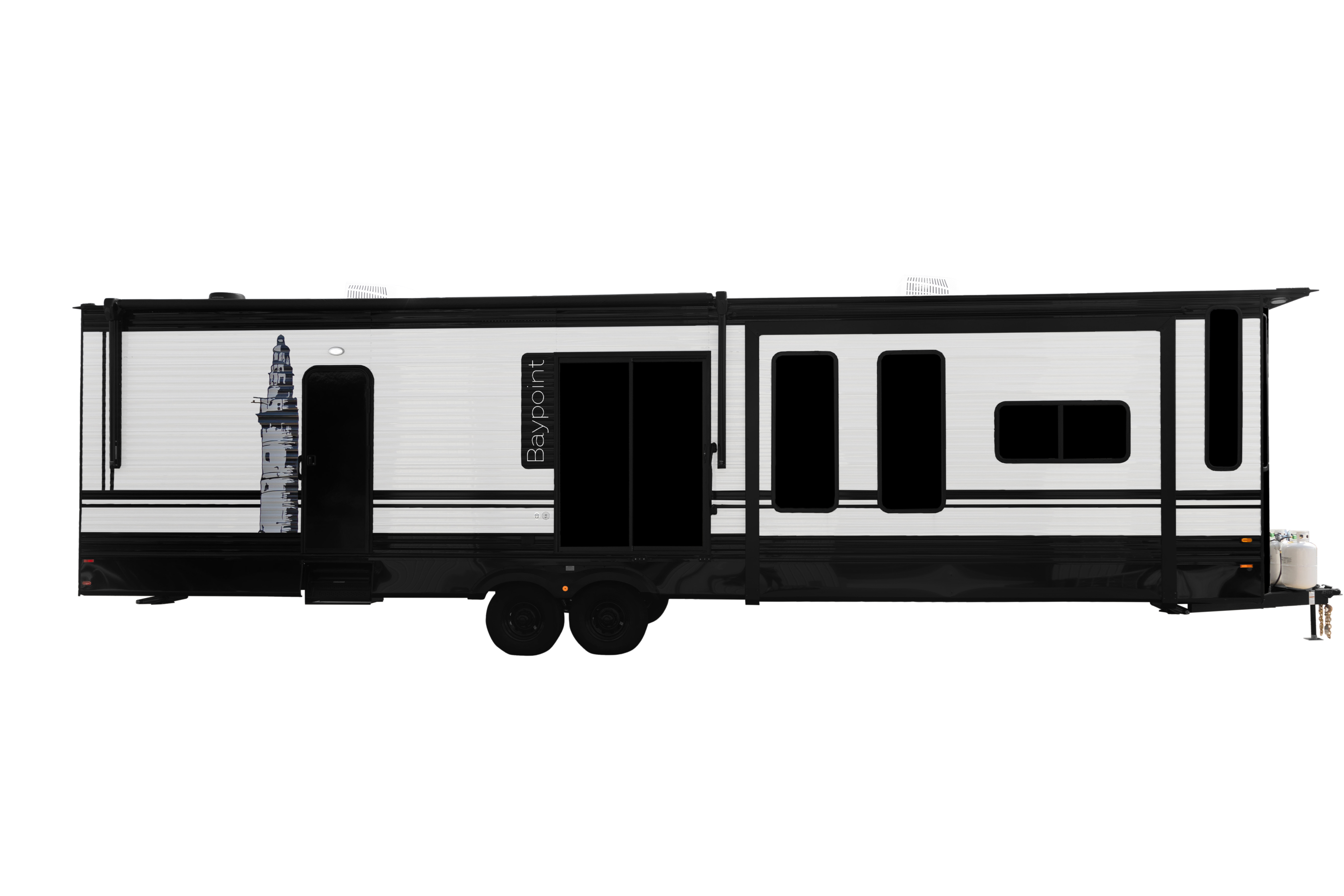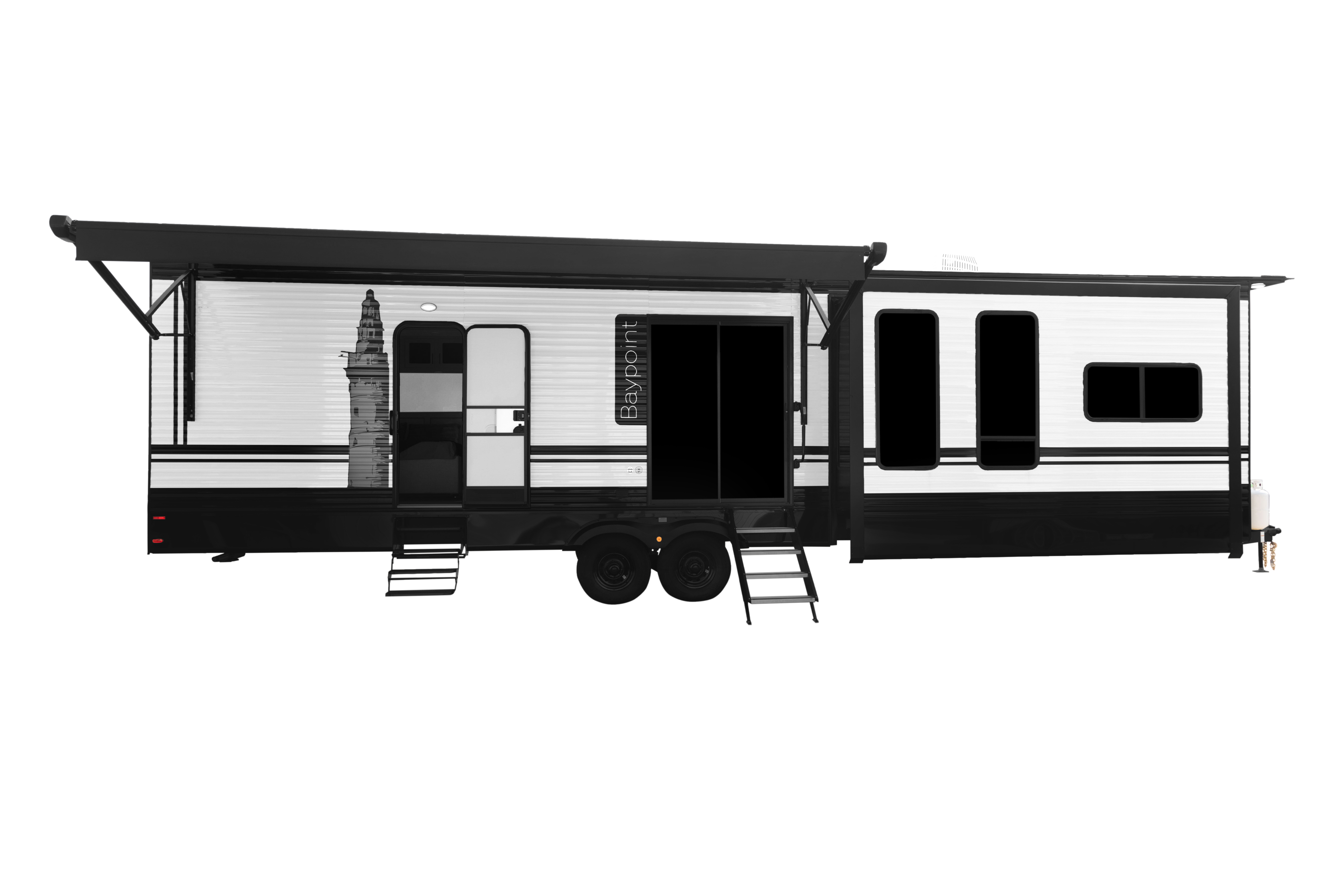 The Baypoint 391IK1B sets a new standard for destination trailers with its striking modern design and residential-inspired layout. From the outside, the sleek black-and-white full-body aesthetic commands attention with bold lines and a refined contemporary presence.