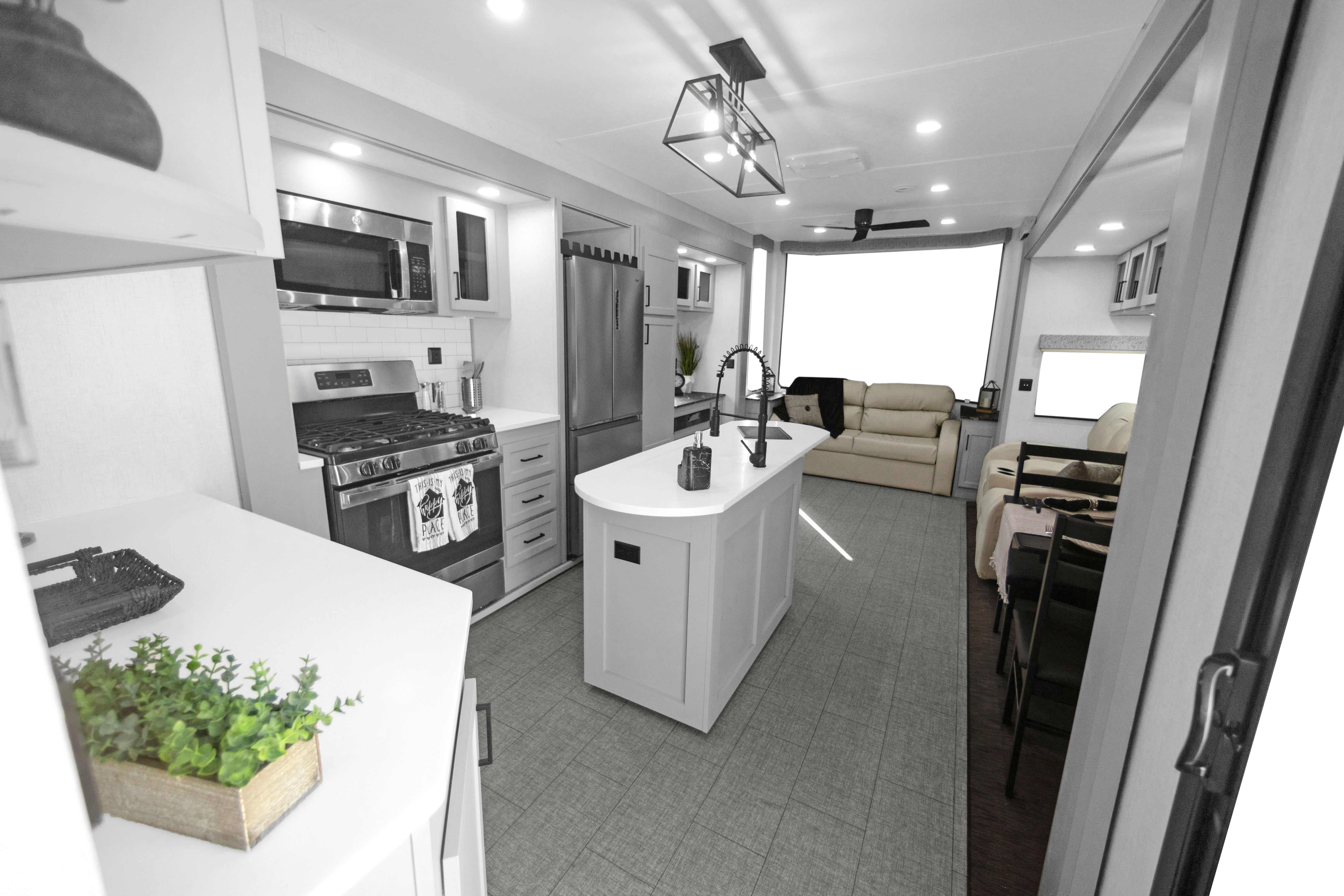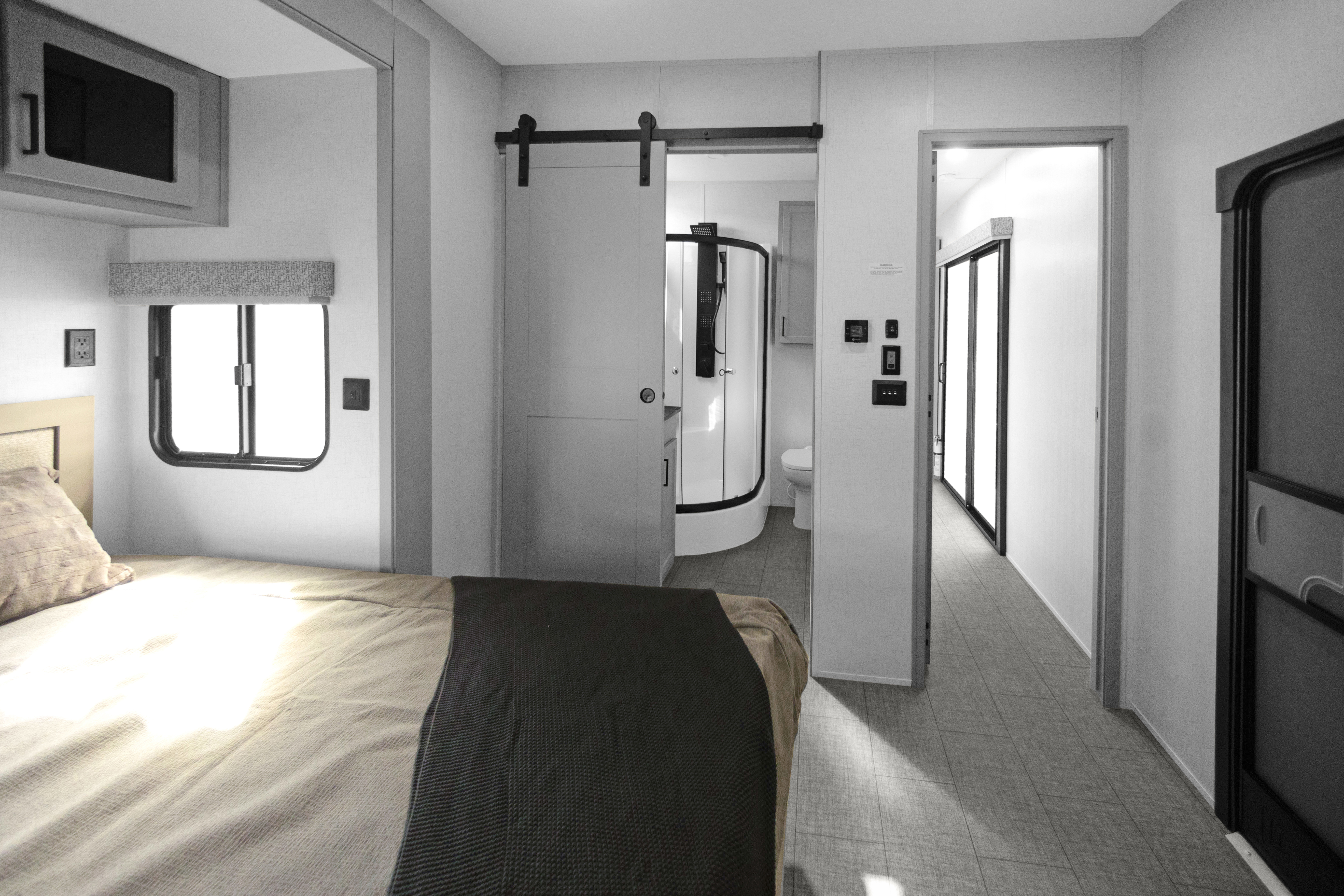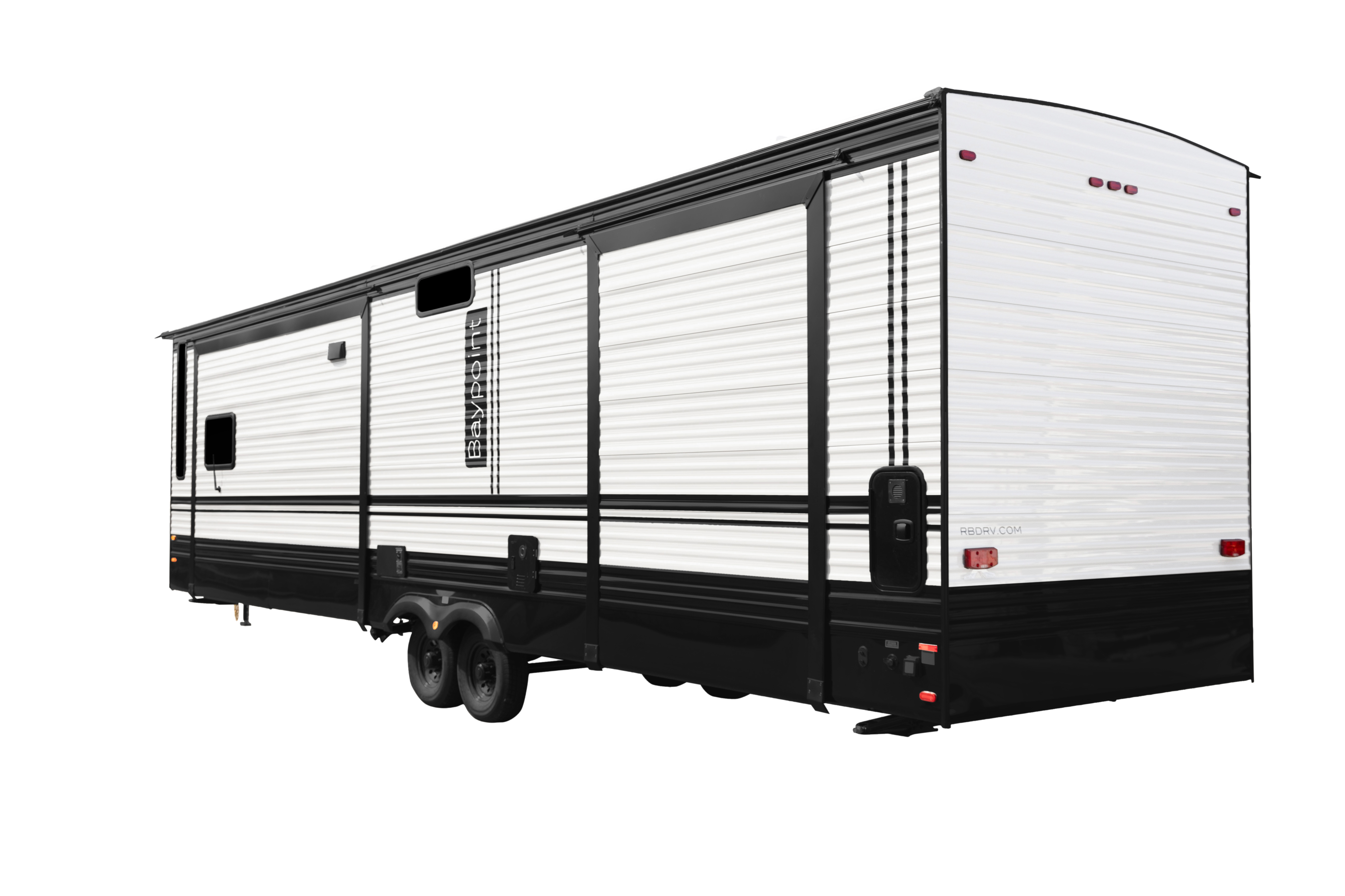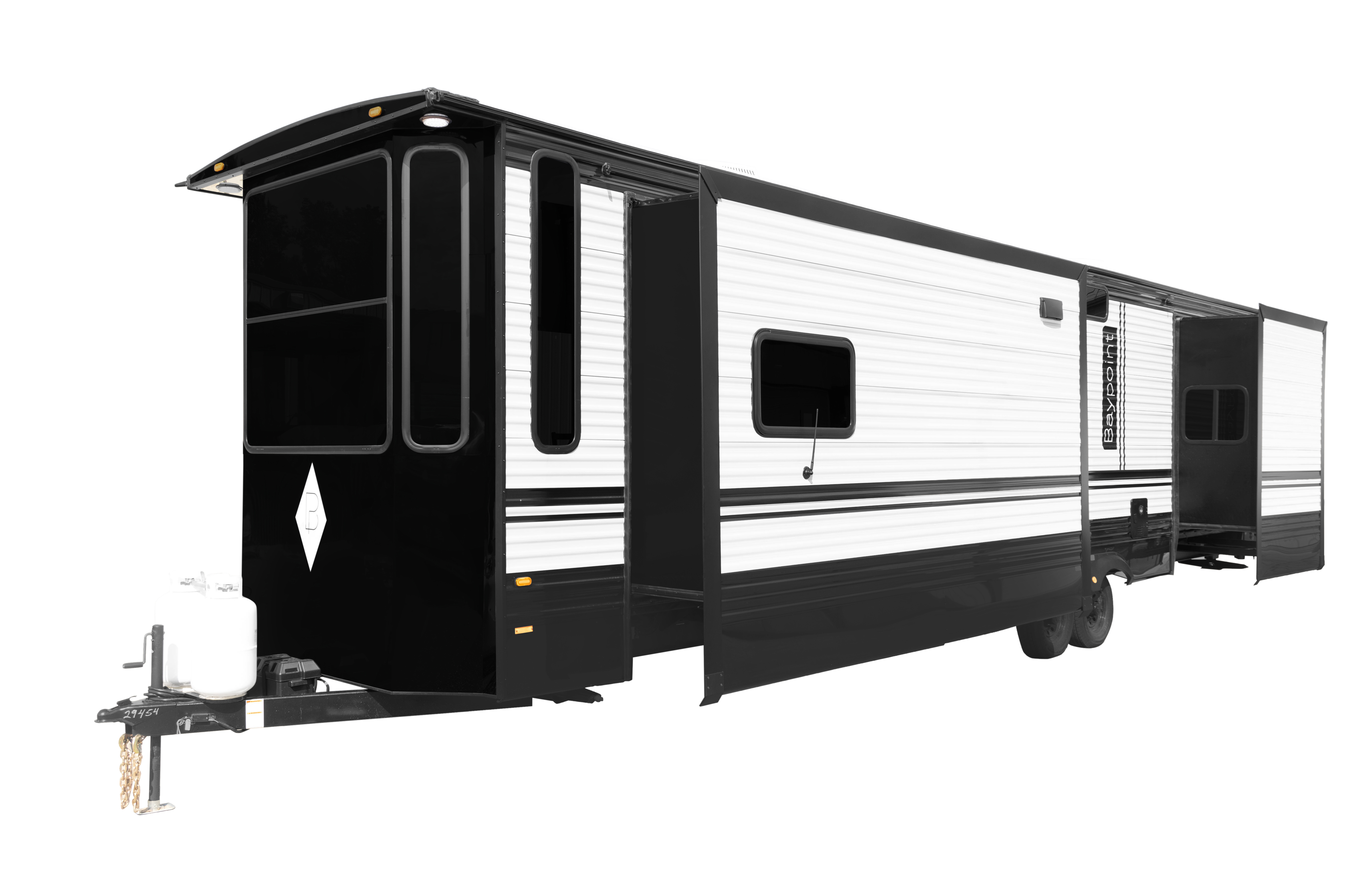 The Baypoint 391IK1B sets a new standard for destination trailers with its striking modern design and residential-inspired layout. From the outside, the sleek black-and-white full-body aesthetic commands attention with bold lines and a refined contemporary presence.