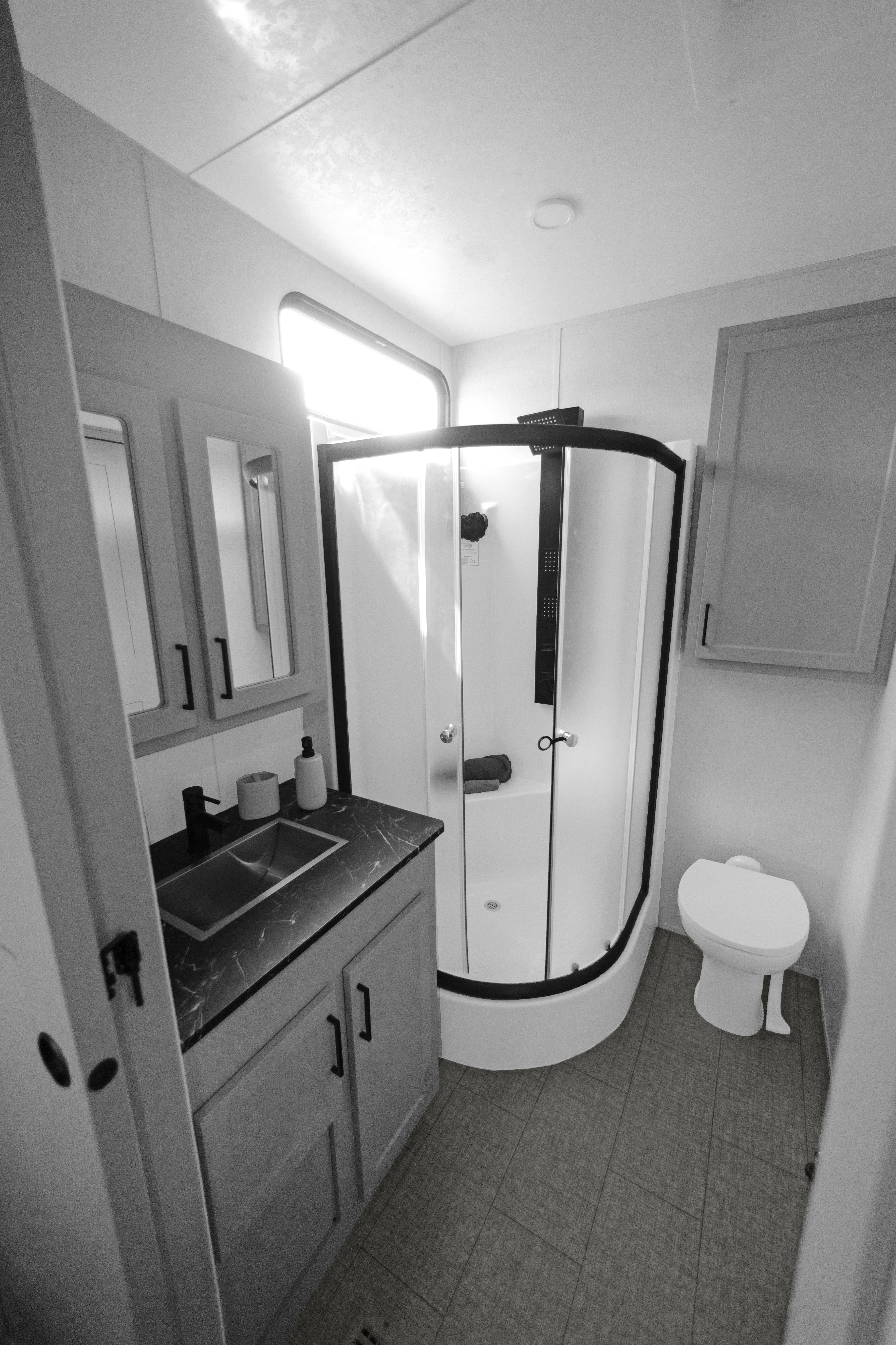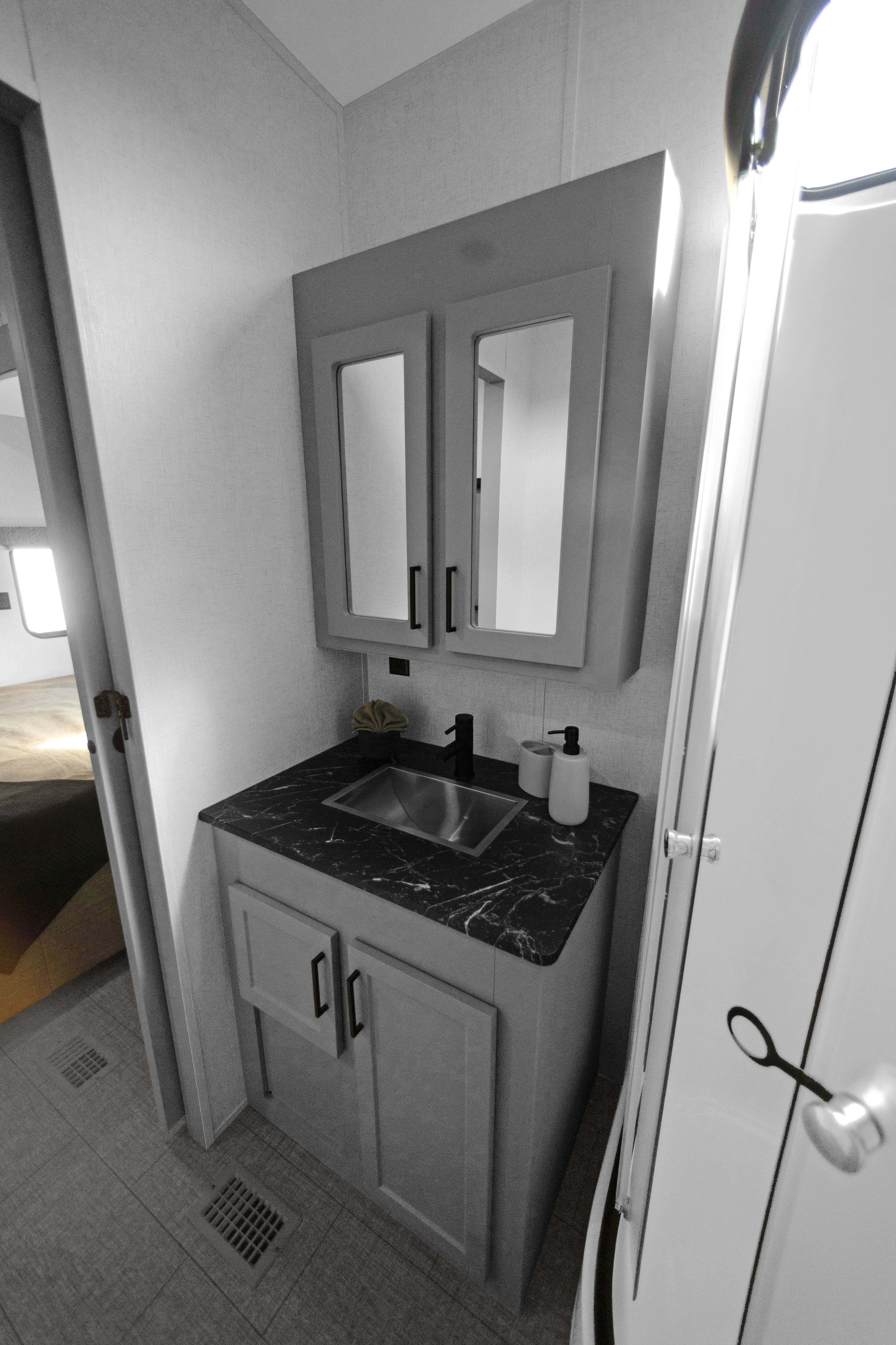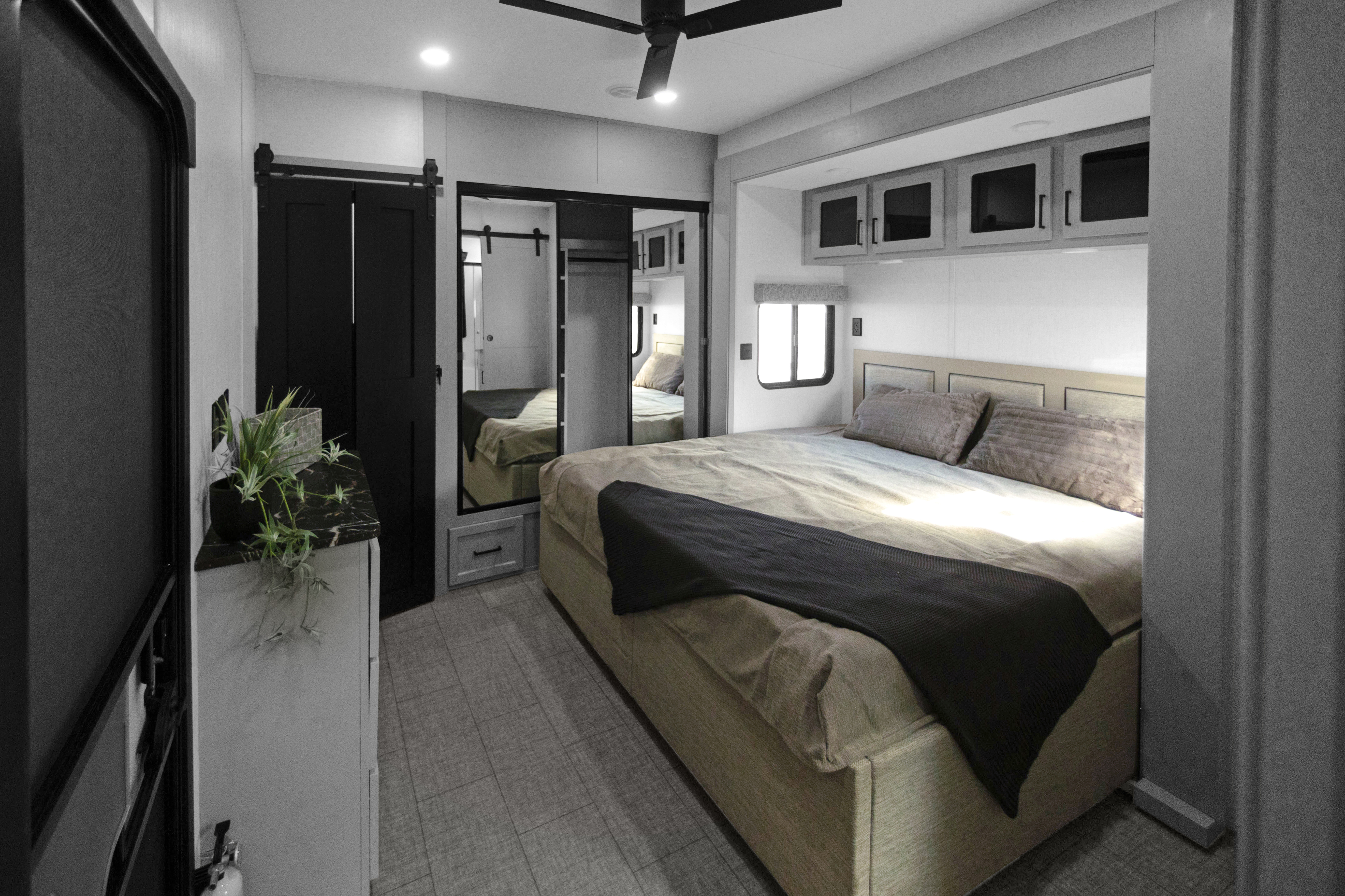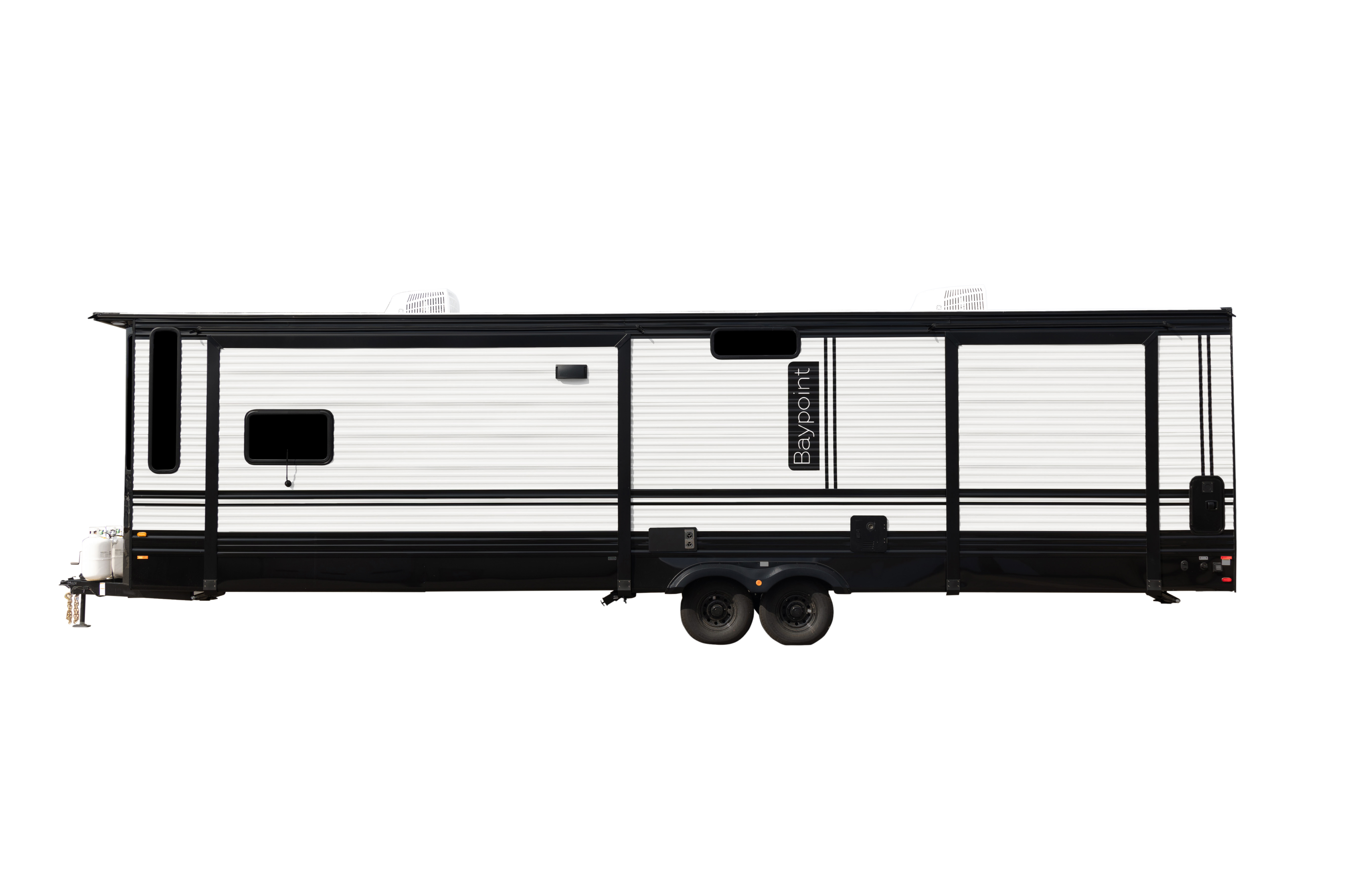 The Baypoint 391IK1B sets a new standard for destination trailers with its striking modern design and residential-inspired layout. From the outside, the sleek black-and-white full-body aesthetic commands attention with bold lines and a refined contemporary presence.