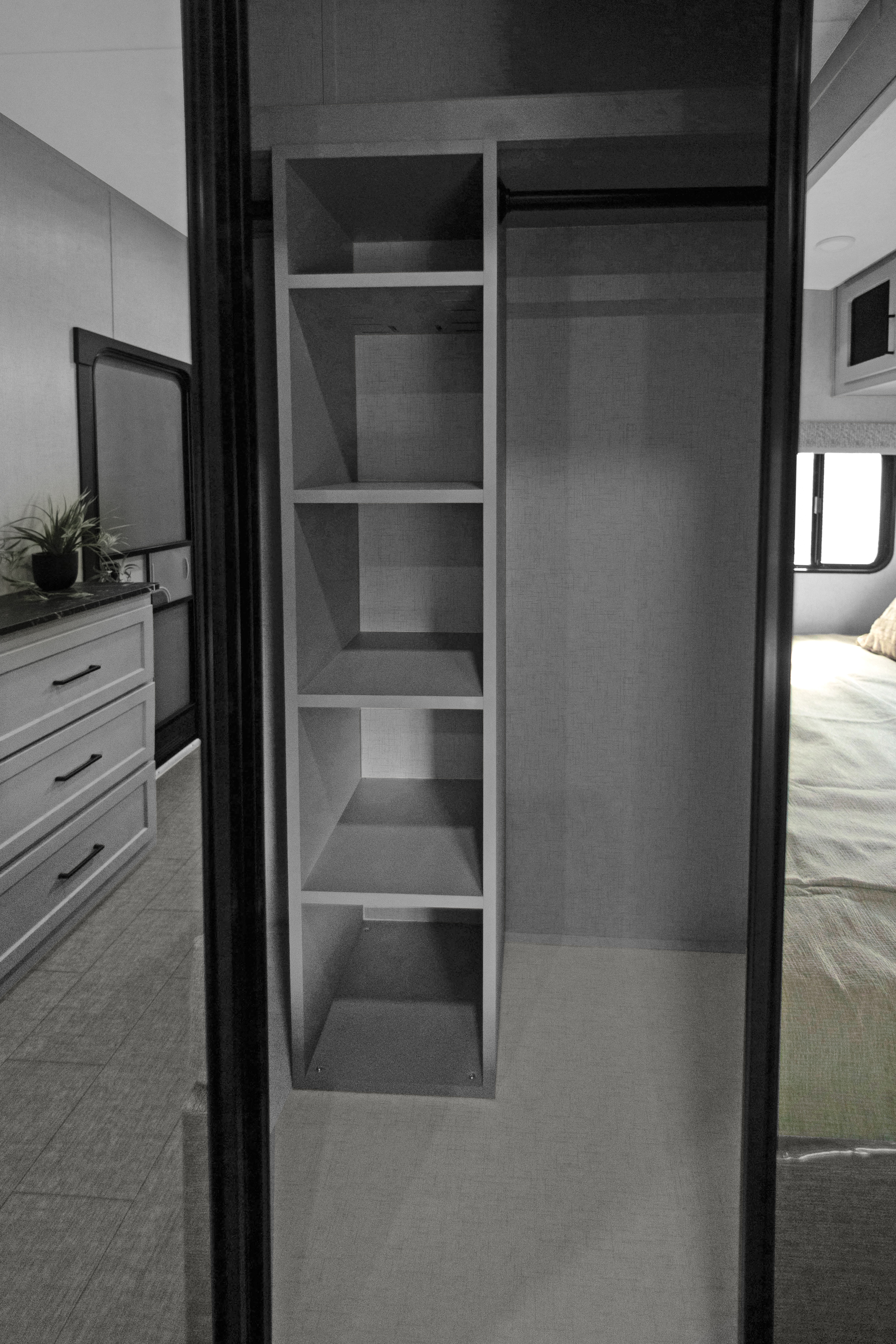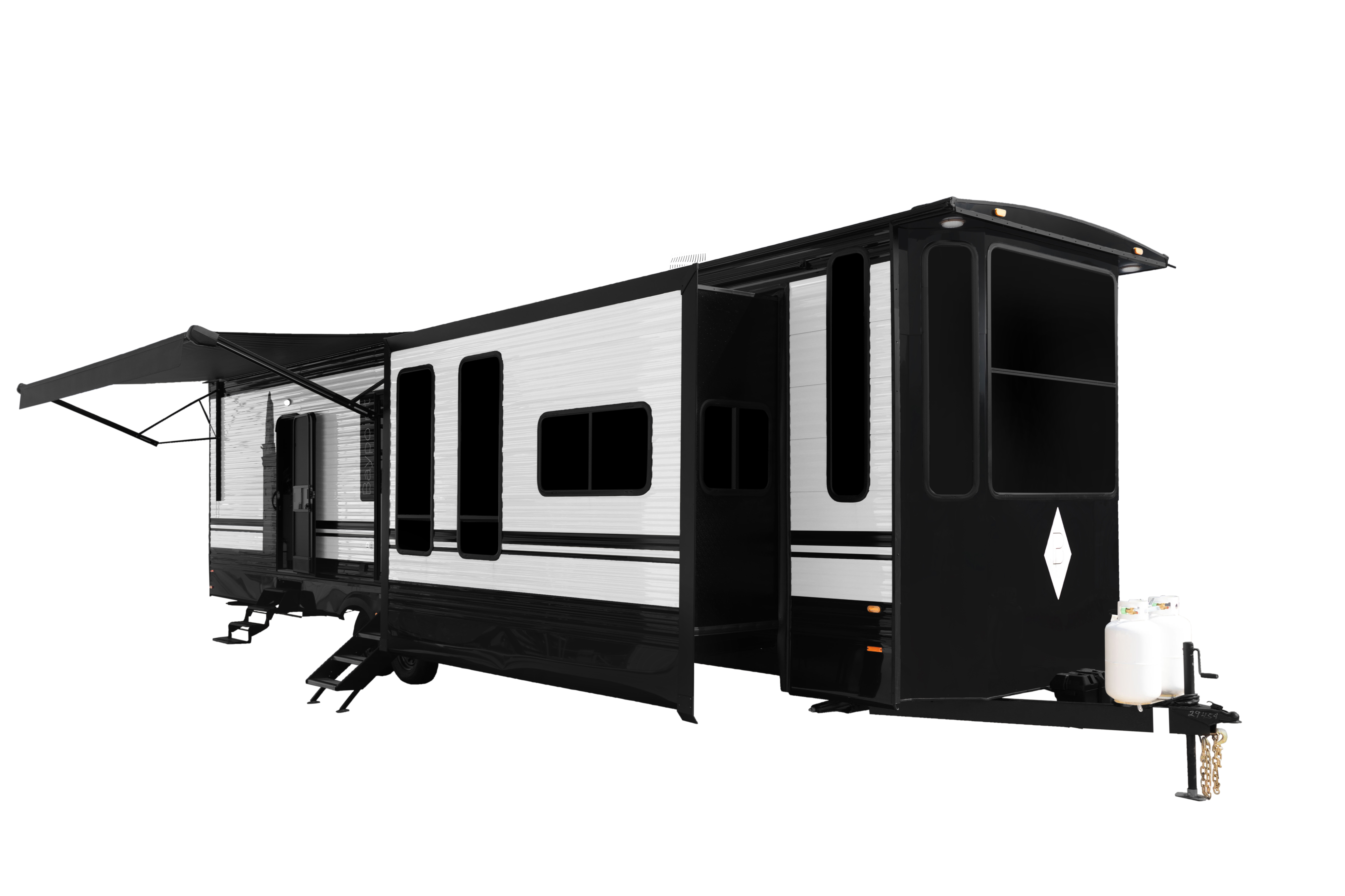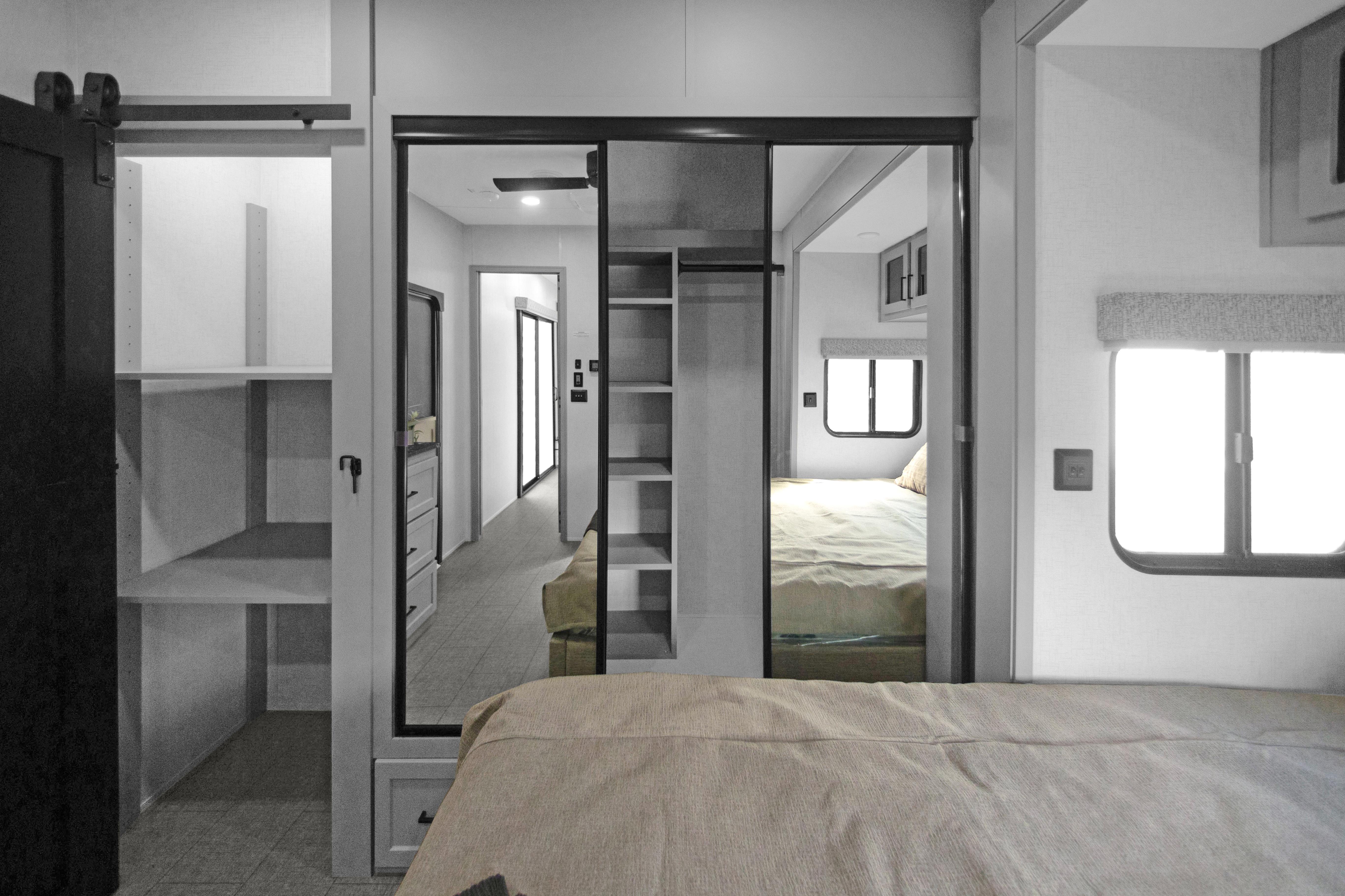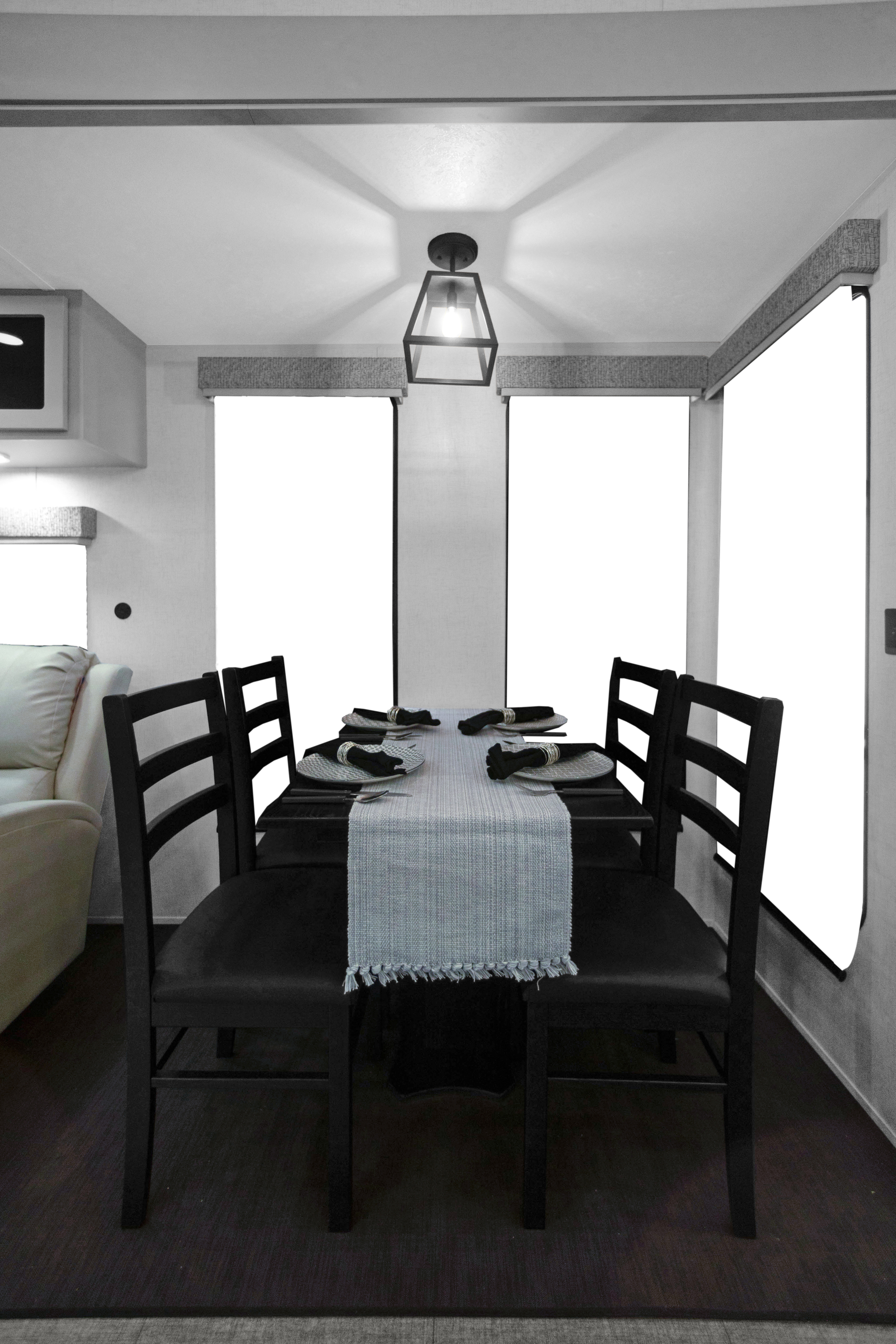 The Baypoint 391IK1B sets a new standard for destination trailers with its striking modern design and residential-inspired layout. From the outside, the sleek black-and-white full-body aesthetic commands attention with bold lines and a refined contemporary presence.