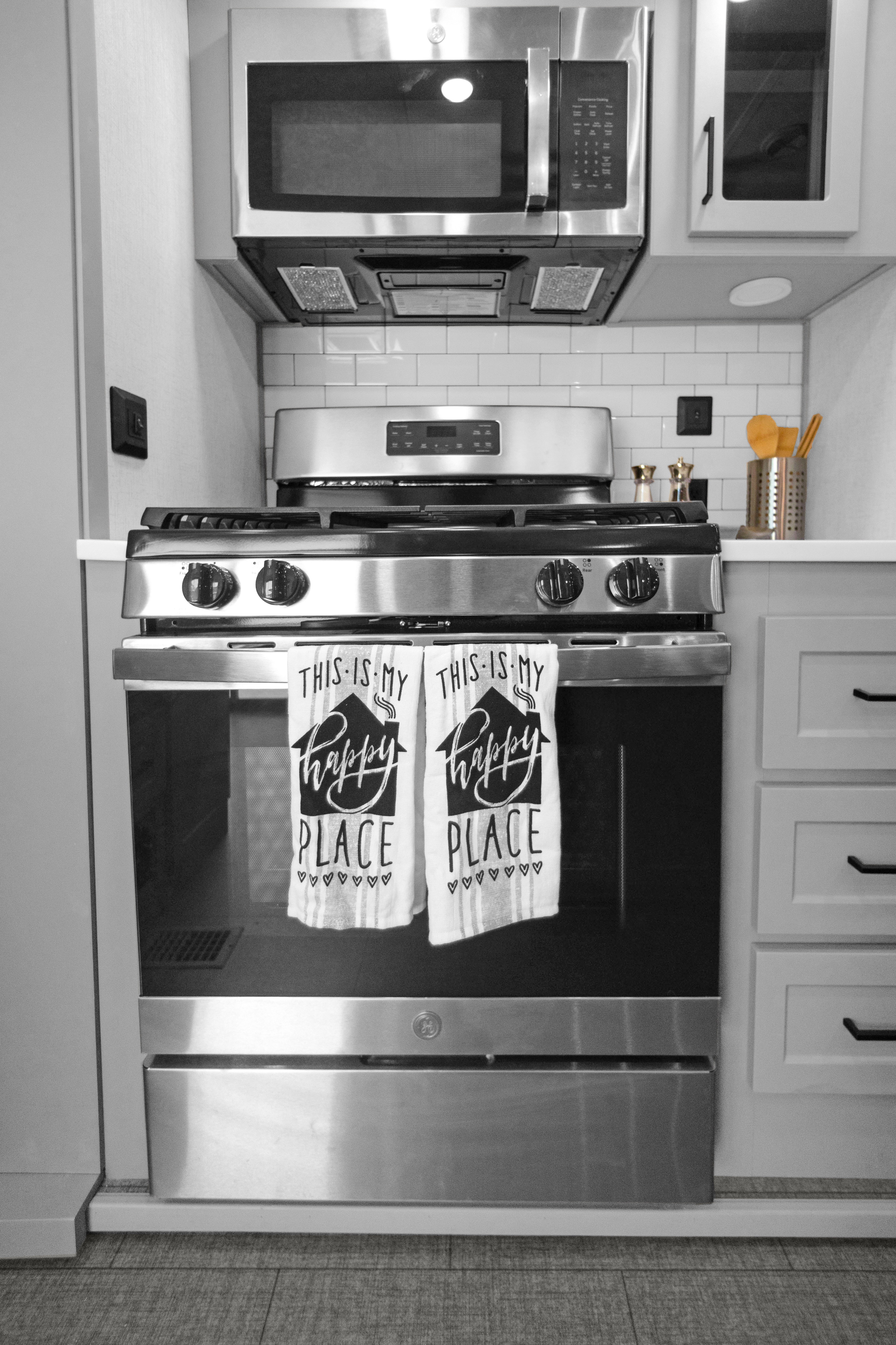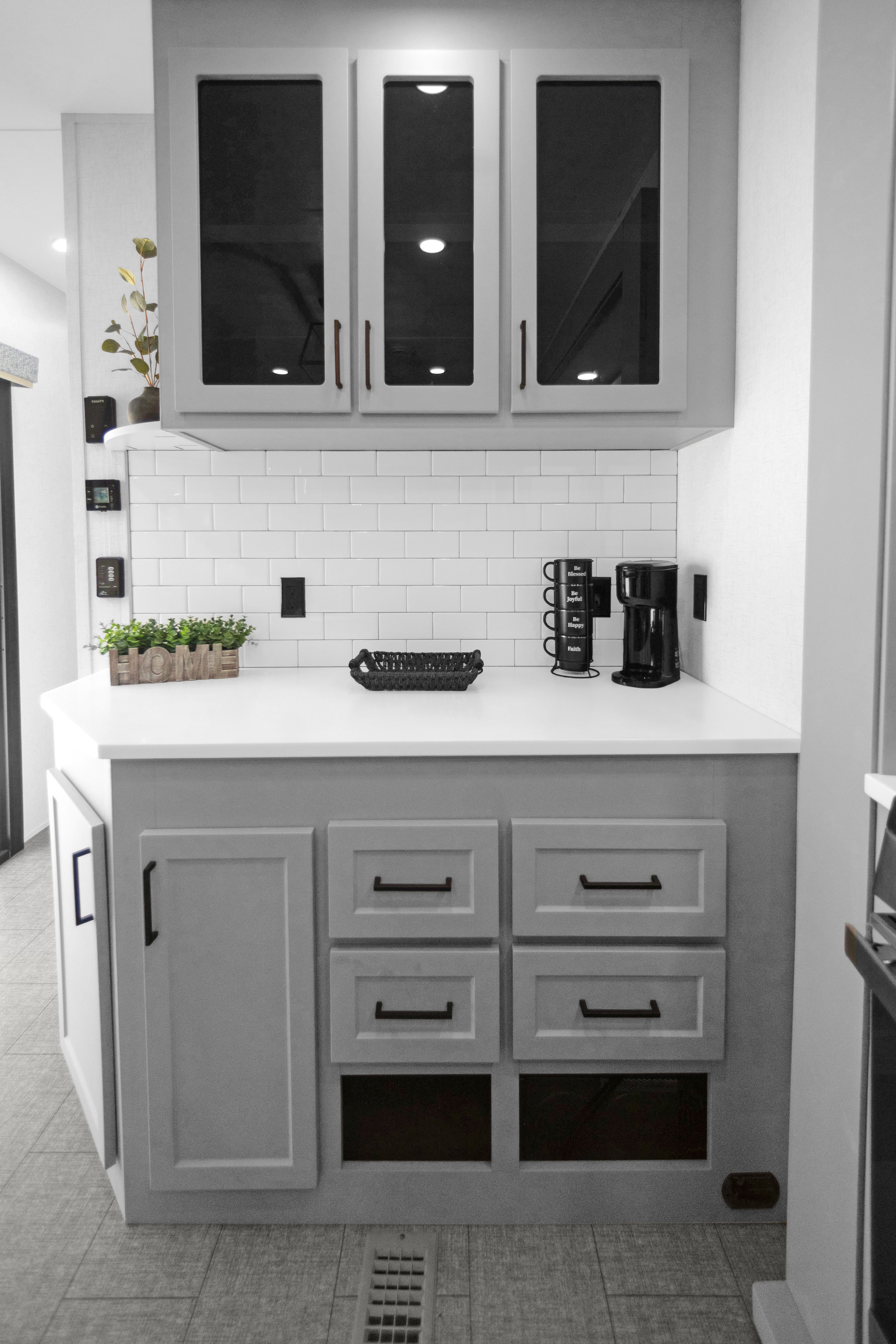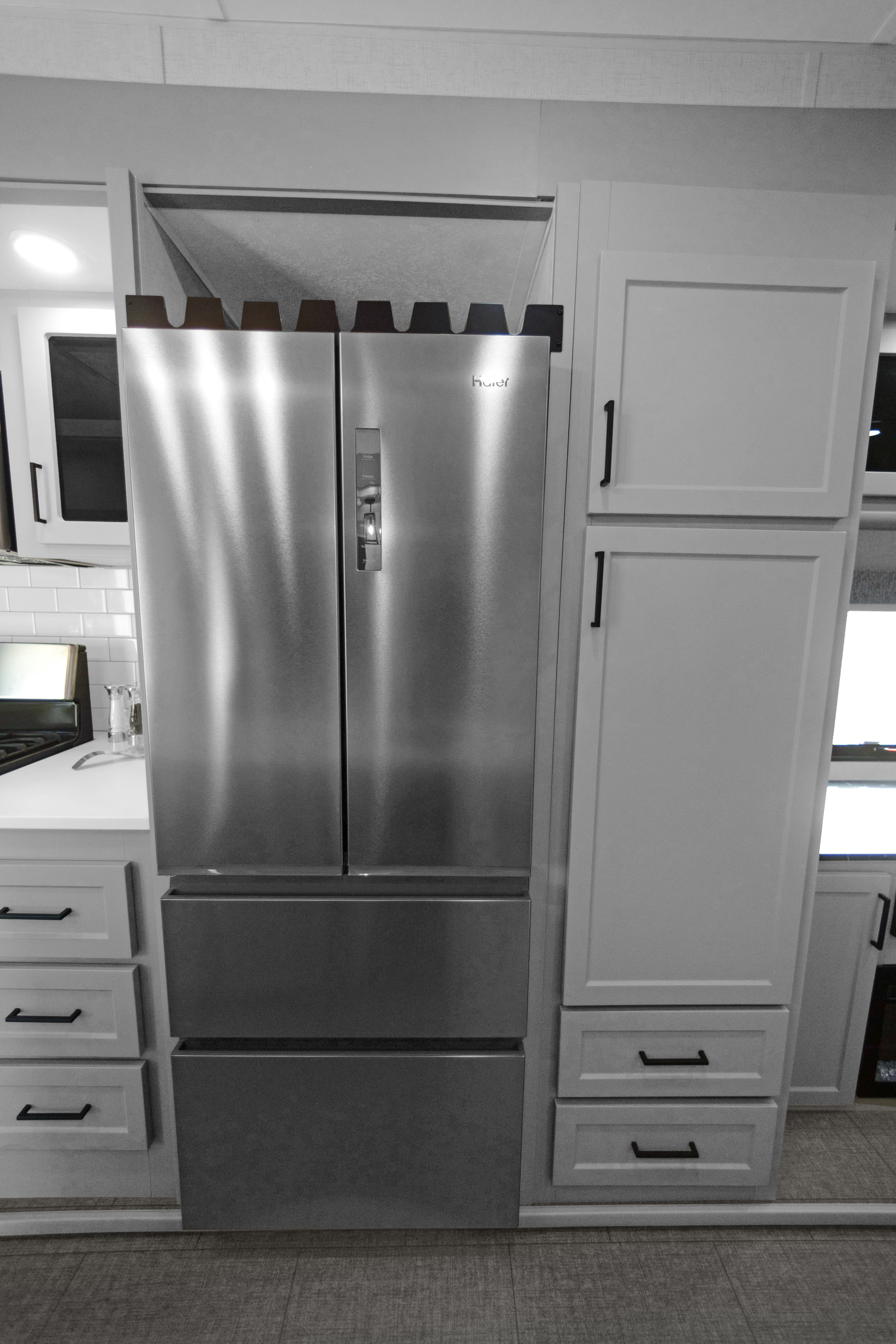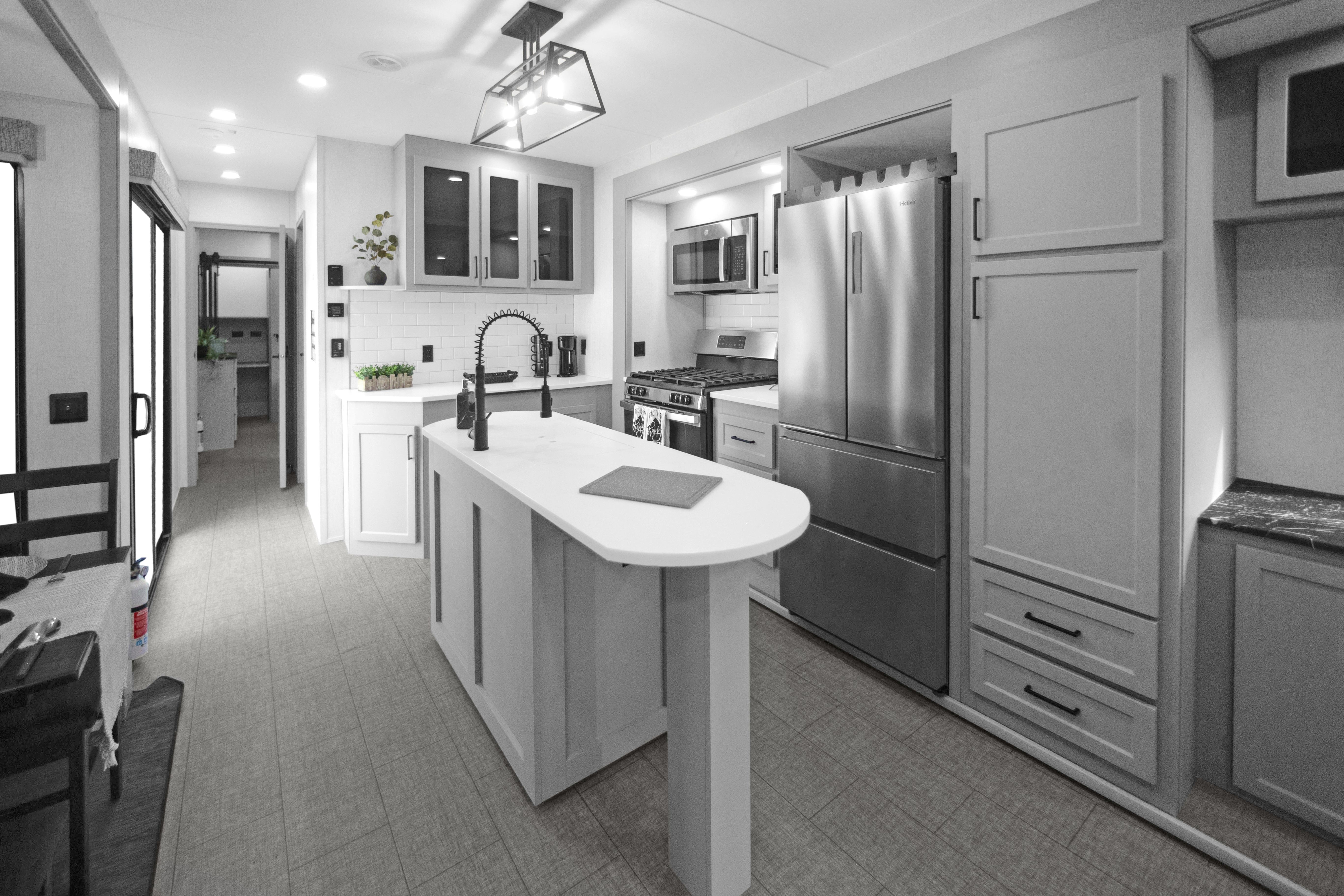 Step inside and you’re greeted by a bright, open-concept kitchen and living area crafted for upscale comfort. The centerpiece island features a solid-surface countertop and commercial-style faucet, creating the perfect space for entertaining or everyday living. A full-size stainless-steel refrigerator, residential range, and built-in microwave complete the